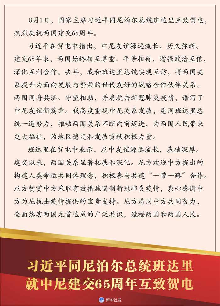 習近平在賀電中指出,中尼友誼源遠流長、歷久彌新。建交65年來,兩國始終相互尊重、平等相待,增強政治互信,深化互利合作。去年,我和班達里總統實現互訪,將兩國關系提升為面向發展與繁榮的世代友好的戰略合作伙伴關系。兩國同舟共濟、守望相助,并肩抗擊新冠肺炎疫情,譜寫了中尼友誼新篇章。我高度重視中尼關系發展,愿同班達里總統一道努力,推動兩國關系不斷向前邁進,為兩國人民帶來更大福祉,為地區穩定和發展貢獻積極力量。