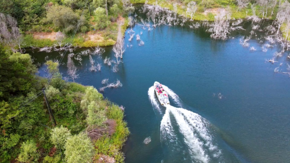 8月21日拍攝的北京市密云水庫綜合執(zhí)法大隊水上分隊隊員執(zhí)行任務(wù)(無人機拍攝)(記者夏子麟攝)