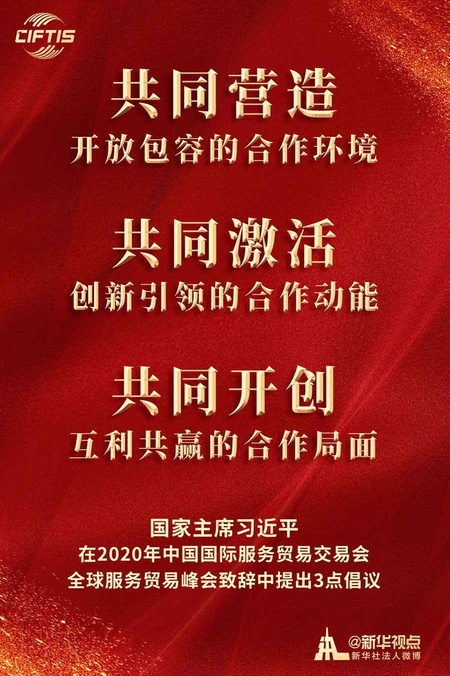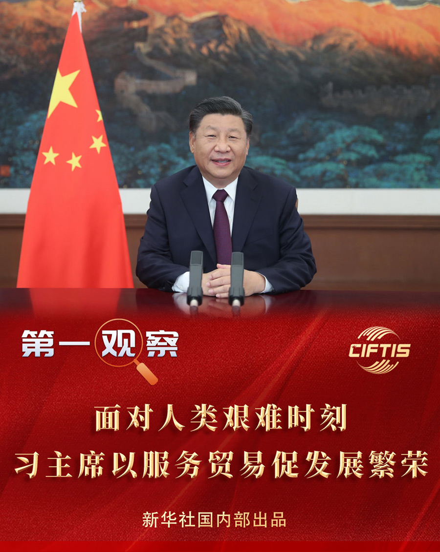 “希望以此為契機(jī),搭建起平臺(tái)和橋梁,讓各國(guó)人民充分展示服務(wù)貿(mào)易領(lǐng)域新發(fā)展新突破,共同享受人類社會(huì)發(fā)展進(jìn)步新技術(shù)新成果?!绷?xí)近平主席在致辭中說(shuō)。
