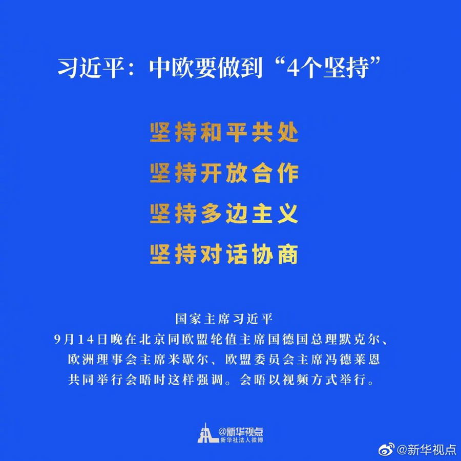 習(xí)近平強(qiáng)調(diào),新冠肺炎疫情大流行使百年未有之大變局加速演進(jìn),人類站在新的十字路口。中歐要堅(jiān)定不移推動(dòng)全面戰(zhàn)略伙伴關(guān)系健康穩(wěn)定發(fā)展,做到“4個(gè)堅(jiān)持”:堅(jiān)持和平共處,堅(jiān)持開放合作,堅(jiān)持多邊主義,堅(jiān)持對話協(xié)商。