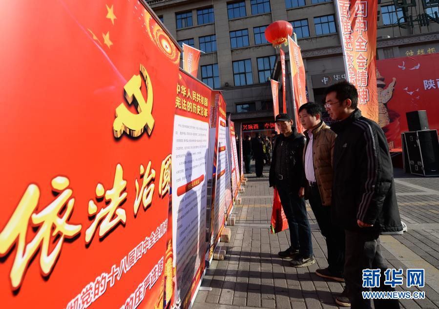 西安市民在國(guó)家憲法日宣傳活動(dòng)現(xiàn)場(chǎng)觀看依法治國(guó)宣傳展板(2014年12月4日攝)。新華社記者 李一博 攝