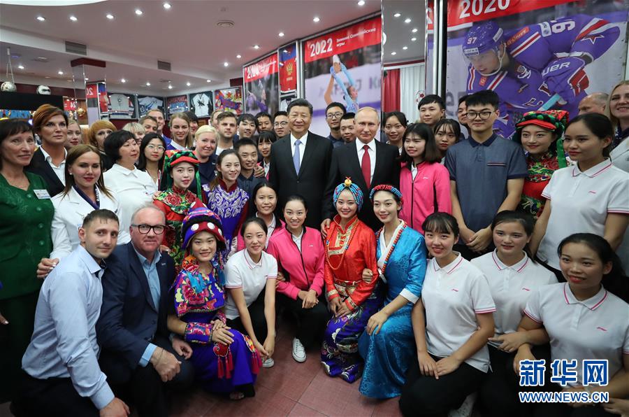 2018年9月12日,國家主席習近平在符拉迪沃斯托克同俄羅斯總統普京一起訪問“海洋”全俄兒童中心。這是習近平和普京同中俄青少年代表及中心教職工代表合影。 新華社記者鞠鵬攝