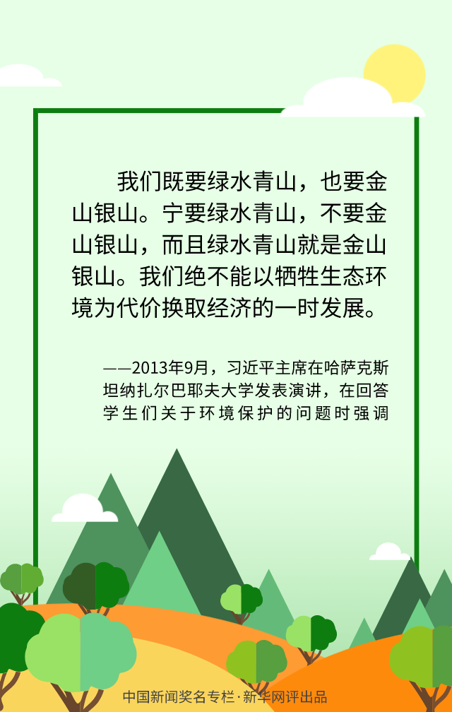 綠水青山就是金山銀山。沿著這條從綠水青山中開辟的道路,把綠水青山就是金山銀山的理念轉化為扎扎實實的行動,在綠水青山中走出一條生態美、產業興、百姓富的可持續發展之路,我們一定能把綠水青山建得更美,把金山銀山做得更大,真正實現青山常在、清水長流、空氣常新。(文字:董璐 海報:滕華)