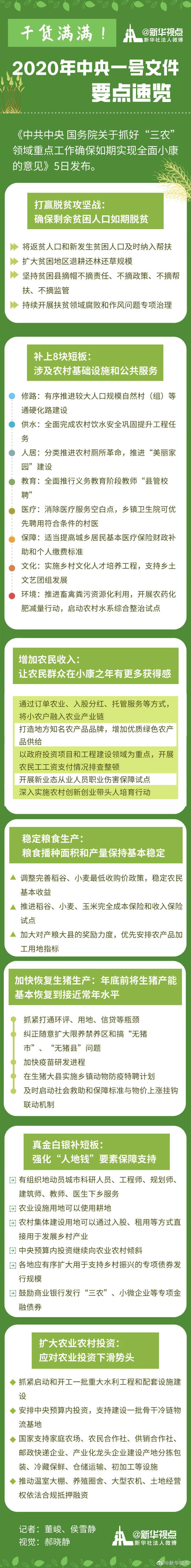 《中共中央 國(guó)務(wù)院關(guān)于抓好“三農(nóng)”領(lǐng)域重點(diǎn)工作確保如期實(shí)現(xiàn)全面小康的意見(jiàn)》5日發(fā)布。針對(duì)集中力量完成打贏脫貧攻堅(jiān)戰(zhàn)和補(bǔ)上全面小康“三農(nóng)”領(lǐng)域突出短板這兩大重點(diǎn)任務(wù),文件有哪些干貨、硬貨? ?