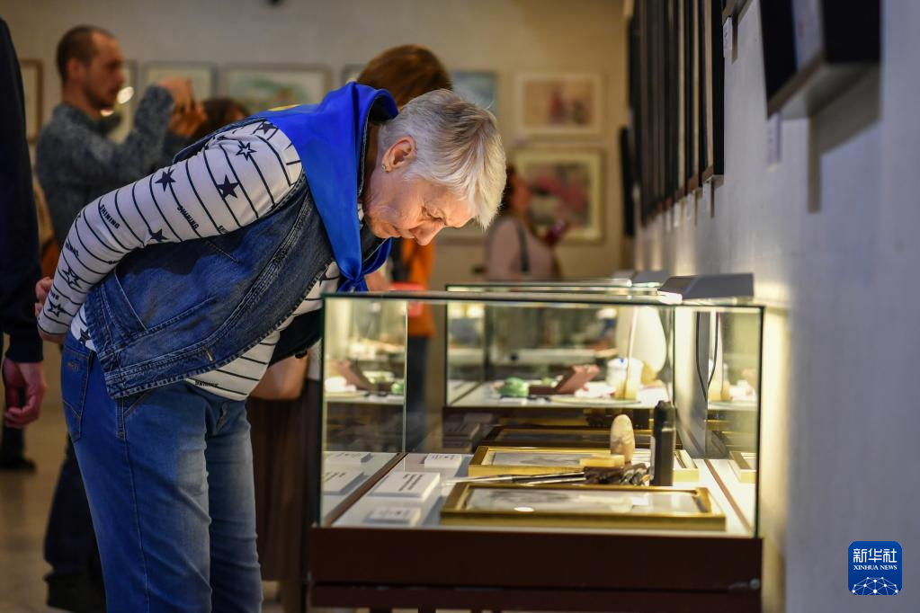 3月30日,人们在俄罗斯莫斯科达尔文博物馆参观中国画和绘画工具。