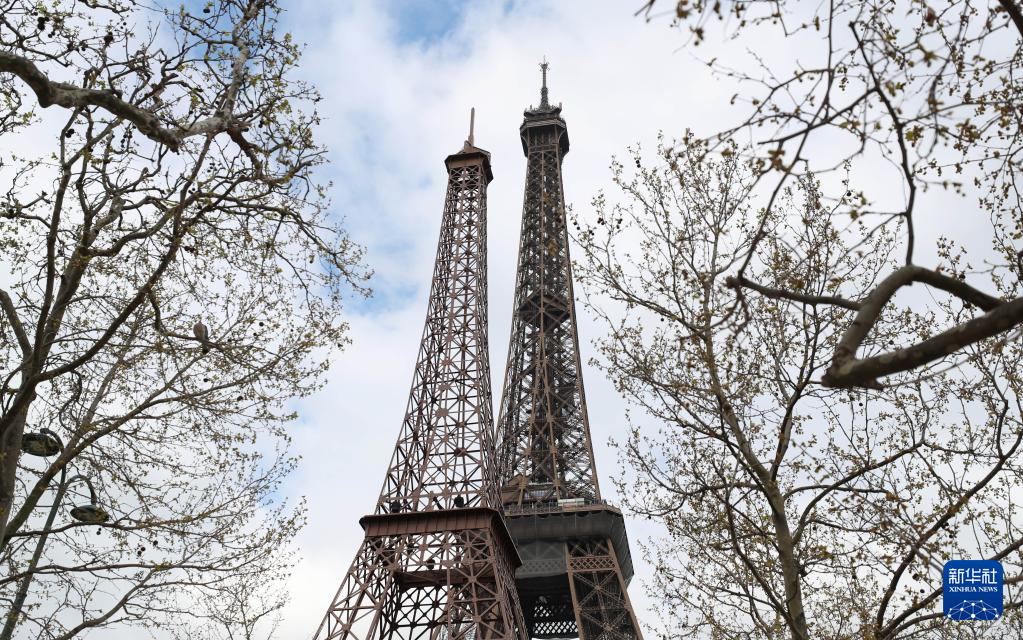 这是4月3日在法国巴黎拍摄的埃菲尔铁塔(右)和“小埃菲尔铁塔”。