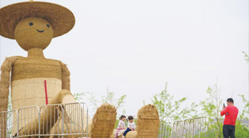 4月12日,诸暨市东白湖镇斯民小学的学生在“寻找春天的色彩课程”中制作花草画。