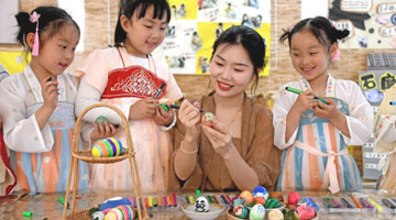 5月7日,在哈尔滨国际会展体育中心,观众在首届东北亚文化艺术创意设计博览会上留影。
