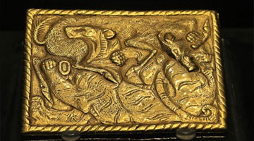 这是展出的镶嵌红宝石金面具(6月16日摄)。