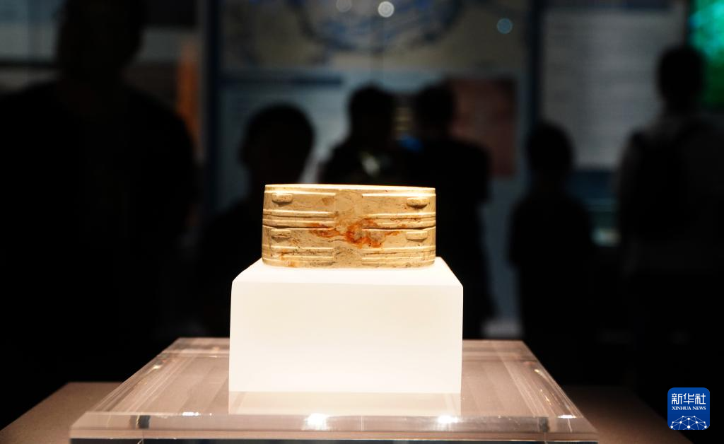 成果展上展出的山东省文物考古研究院藏大汶口文化嵌绿松石象牙雕筒(7月12日摄)。