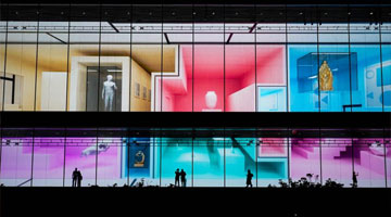 7月21日,孩子们在中国滦州皮影博物馆内参观皮影长卷。