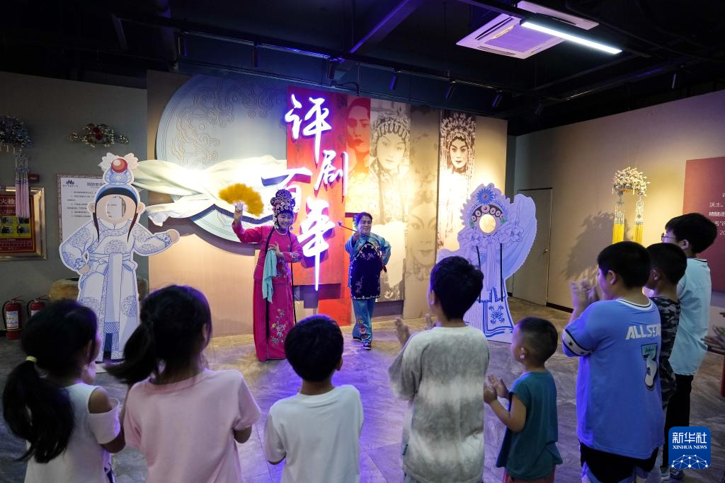 7月21日,在位于河北省滦州市的中国评剧艺术馆,戏曲爱好者在为孩子们表演。