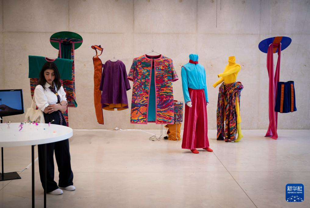这是8月15日在以色列比撒列艺术设计学院毕业展上拍摄的服装设计作品。