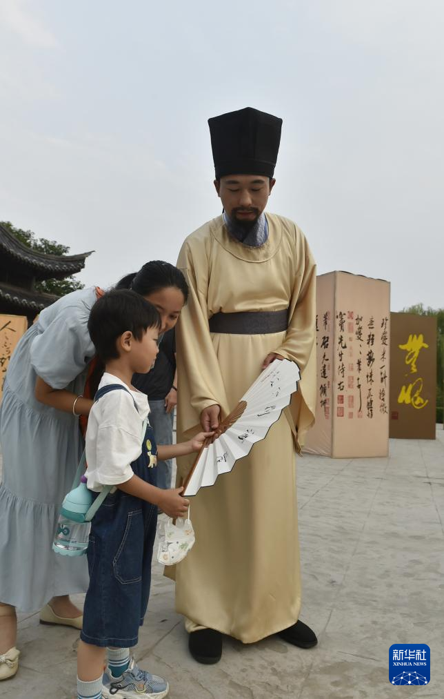 8月19日,身穿古装的工作人员在中国翰园碑林景区与游人互动。