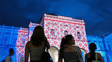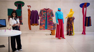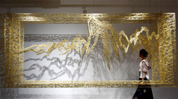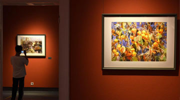 8月24日,在耶路撒冷举行的古代阿拉伯世界饮食文化展上,人们观看描绘婚宴场景的绘画。