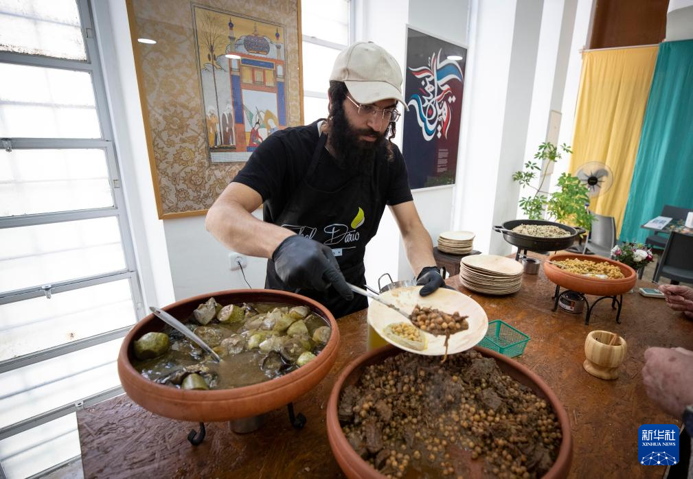 8月24日,在耶路撒冷举行的古代阿拉伯世界饮食文化展上,厨师为参观者提供古代阿拉伯美食同款套餐。