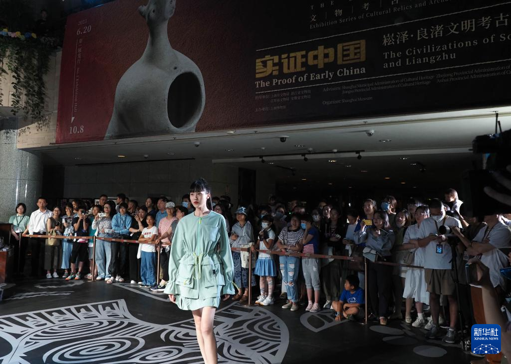 8月25日晚,模特在上博“研色·良渚之夜”综合艺术秀上展示时装。