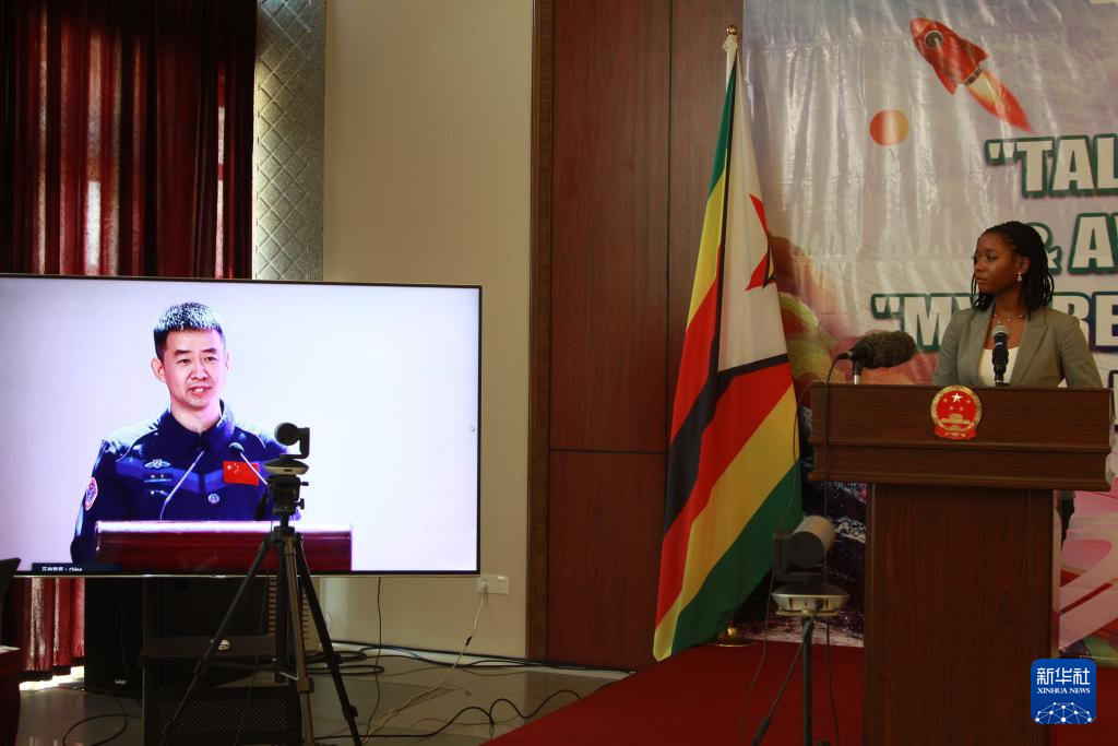 9月13日,在津巴布韦哈拉雷参加“我的梦想”主题绘画颁奖仪式的一名津巴布韦青少年与中国航天员进行视频对话。