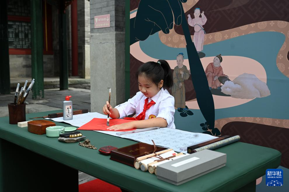 9月25日,小学生在展览现场练习毛笔字。