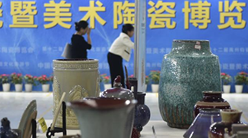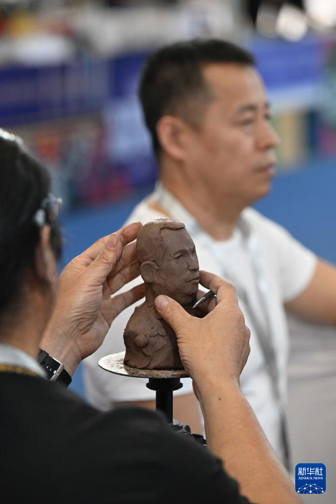 9月30日,工作人员在交易会上展示人物泥塑创作。