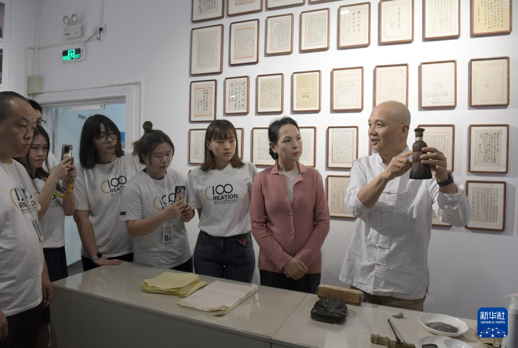 11月8日,魏立中(右一)为师生介绍制作木版水印的技艺。