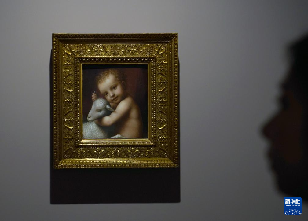 12月9日在上海博物馆展厅里拍摄的达·芬奇学生卢伊尼的油画《男孩与羔羊》。