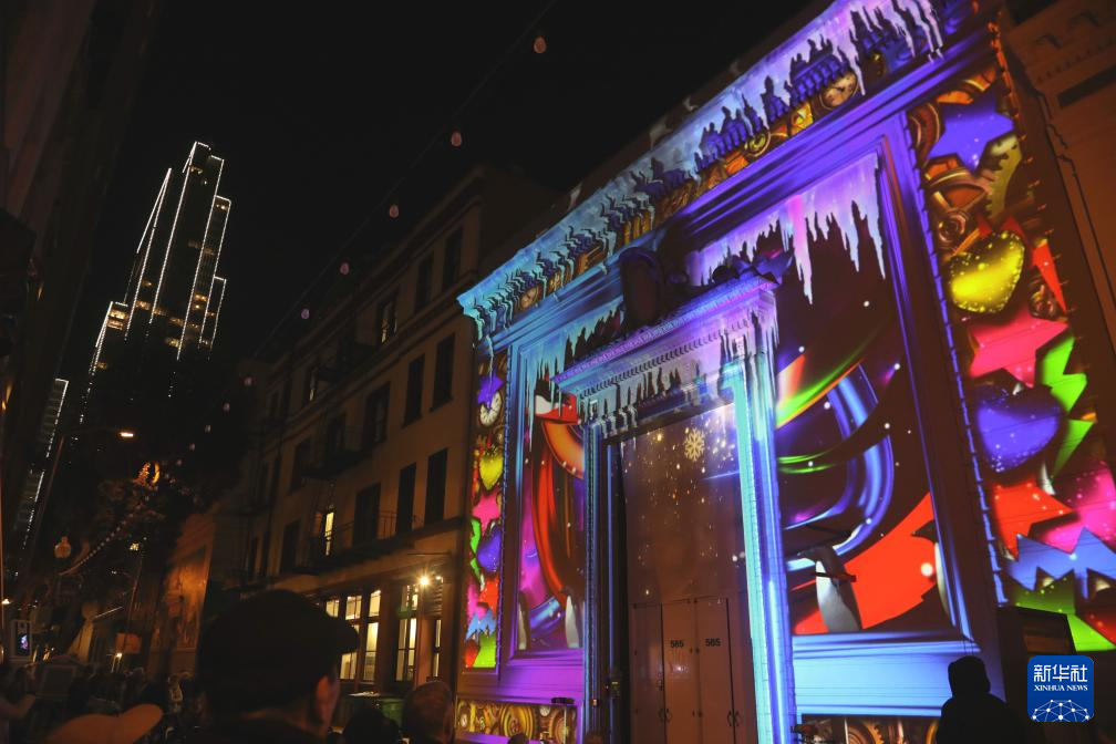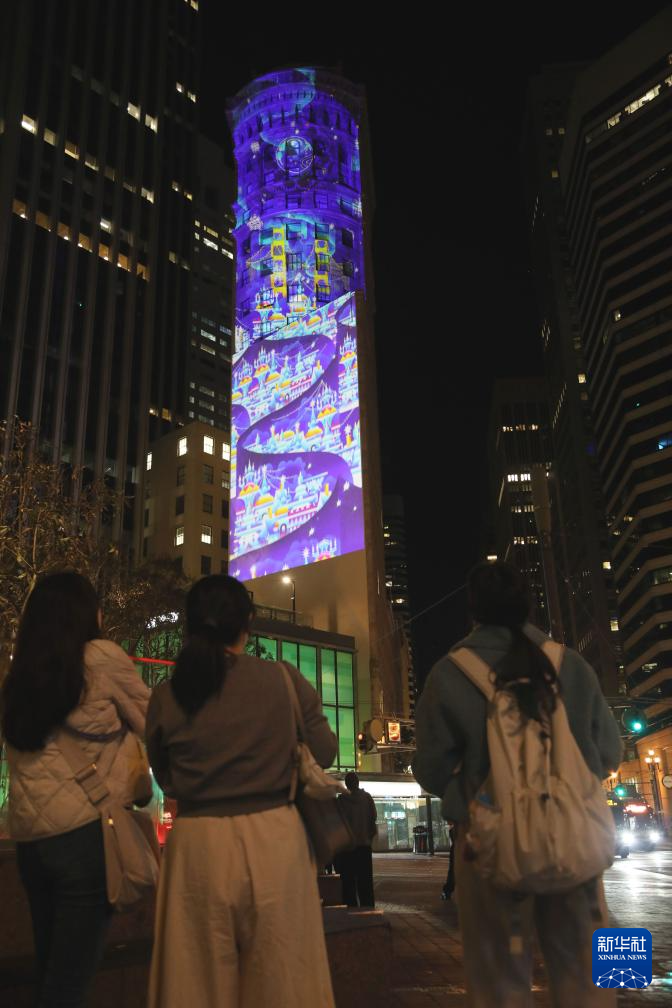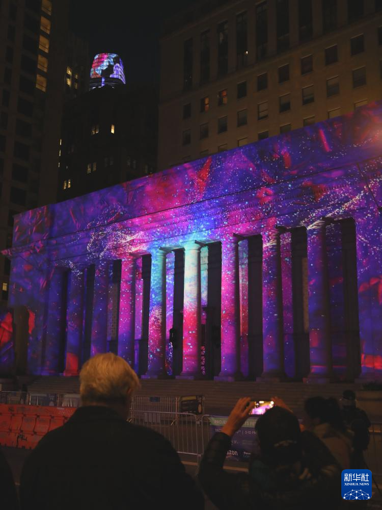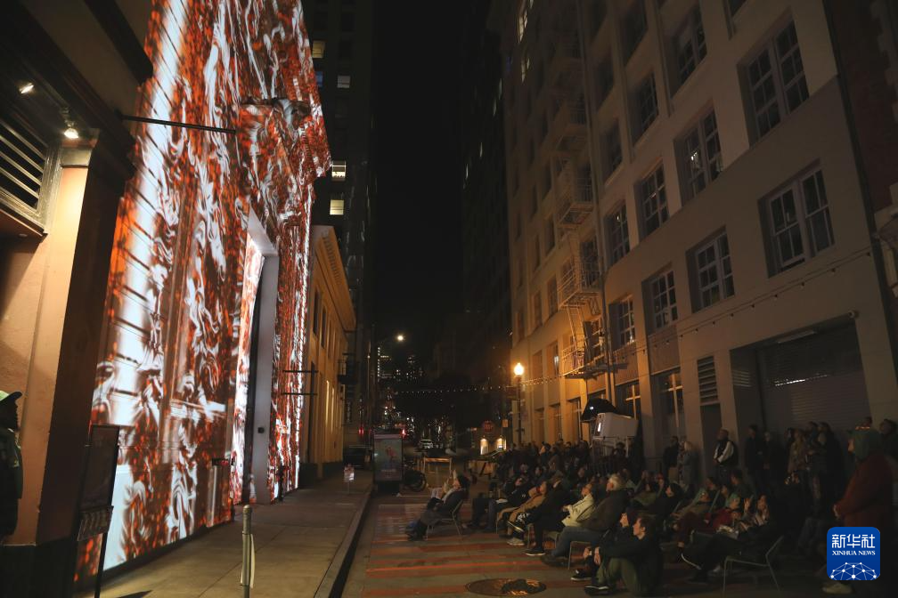 12月10日,人们在美国旧金山观看建筑外墙上的艺术投影。新华社发(刘艺霖摄)
