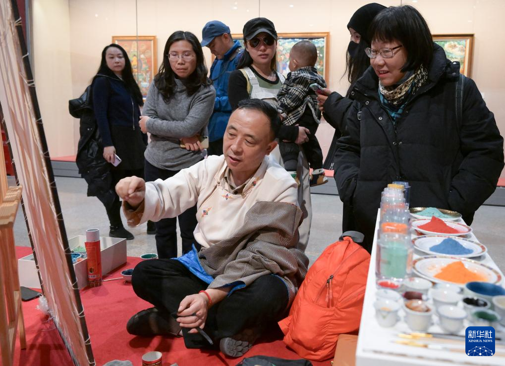 12月27日,一位画师(前左)在展览现场向观众介绍热贡唐卡的绘制工艺。