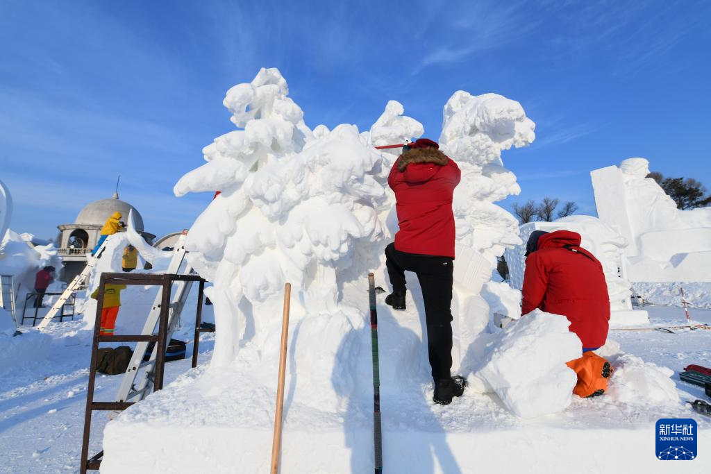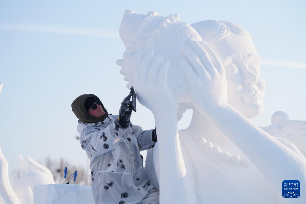 当日,在哈尔滨太阳岛雪博会园区内举行的第26届中国·哈尔滨国际雪雕比赛进入第三天的赛程。