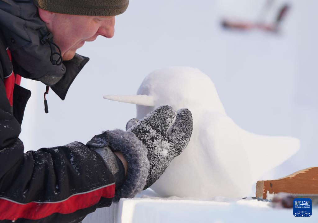 1月8日,参赛选手在进行雪雕创作。