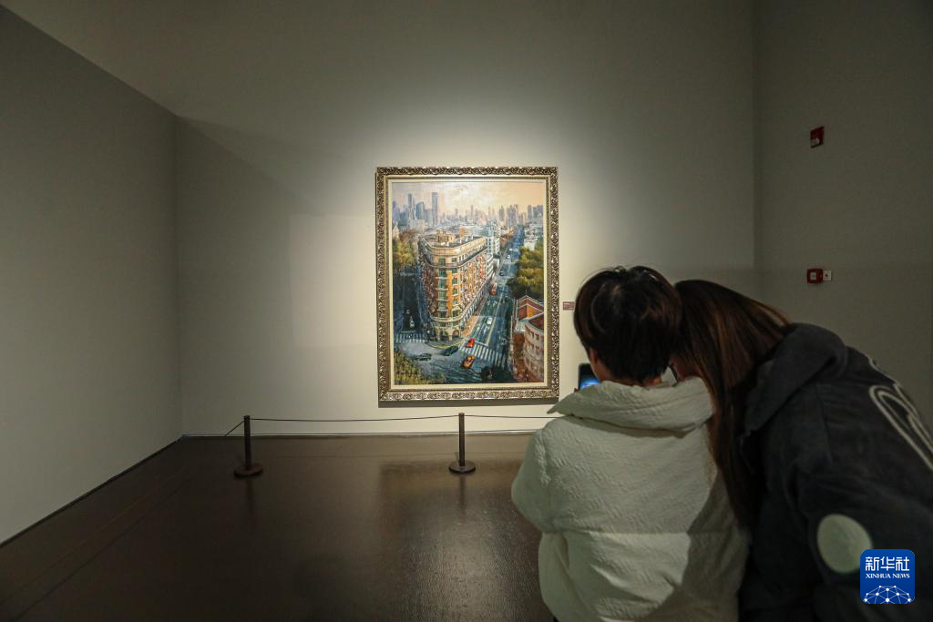 1月12日,观众在参观画作《梧桐深处的武康大楼》。