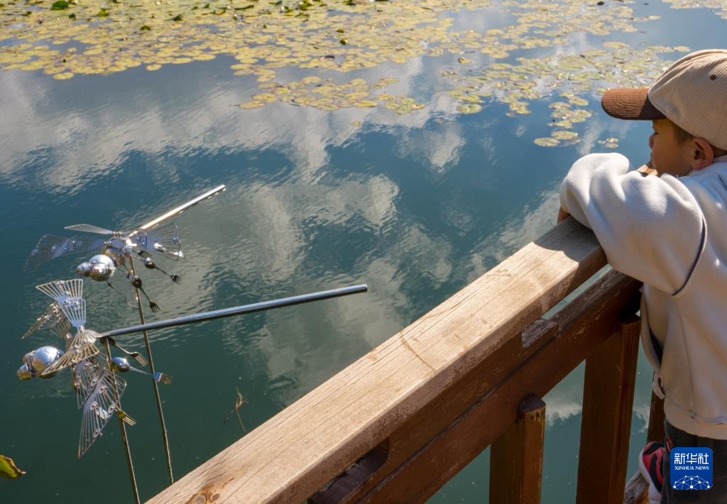 1月28日,一名儿童在昆明宝丰湿地公园参观展览作品《蜻蜓船琵琶》。