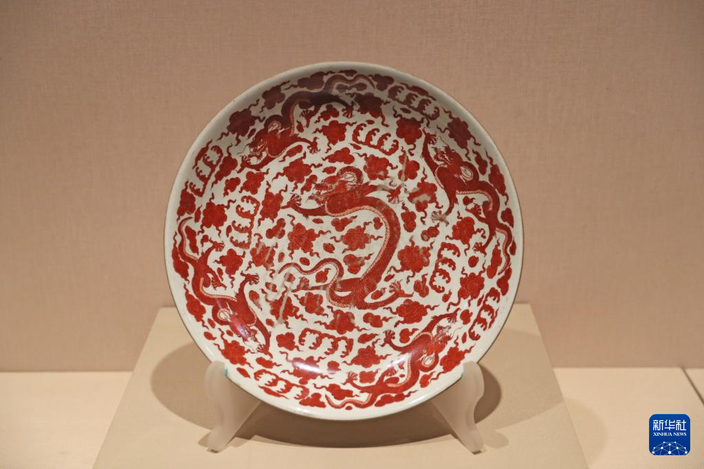 2月2日在辽宁省博物馆拍摄的矾红彩双龙戏珠纹盘。