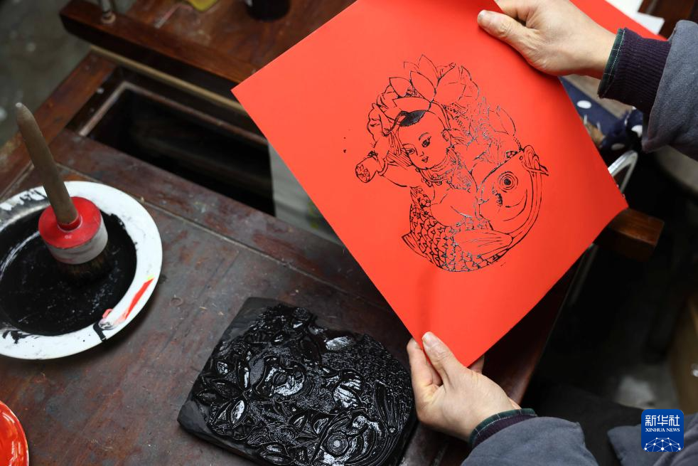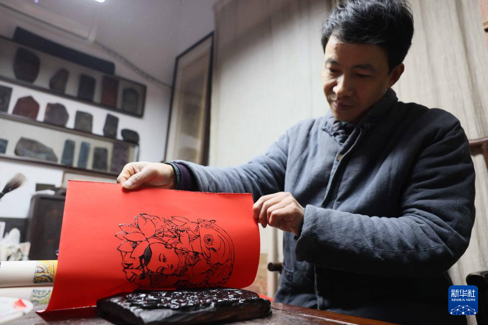 2月4日,在童寿记木版年画工作室,非遗传承人童敏在印制年画。