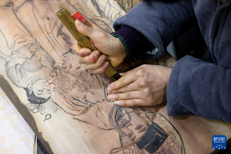 2月4日,在童寿记木版年画工作室,非遗传承人童敏在进行年画刻版。