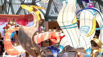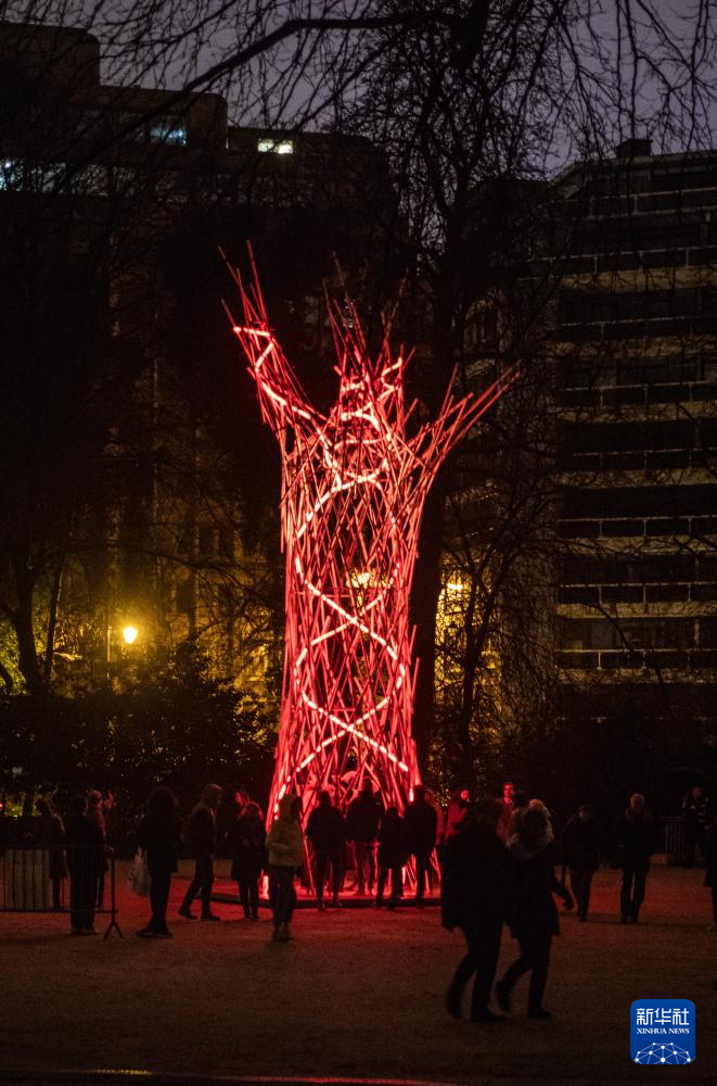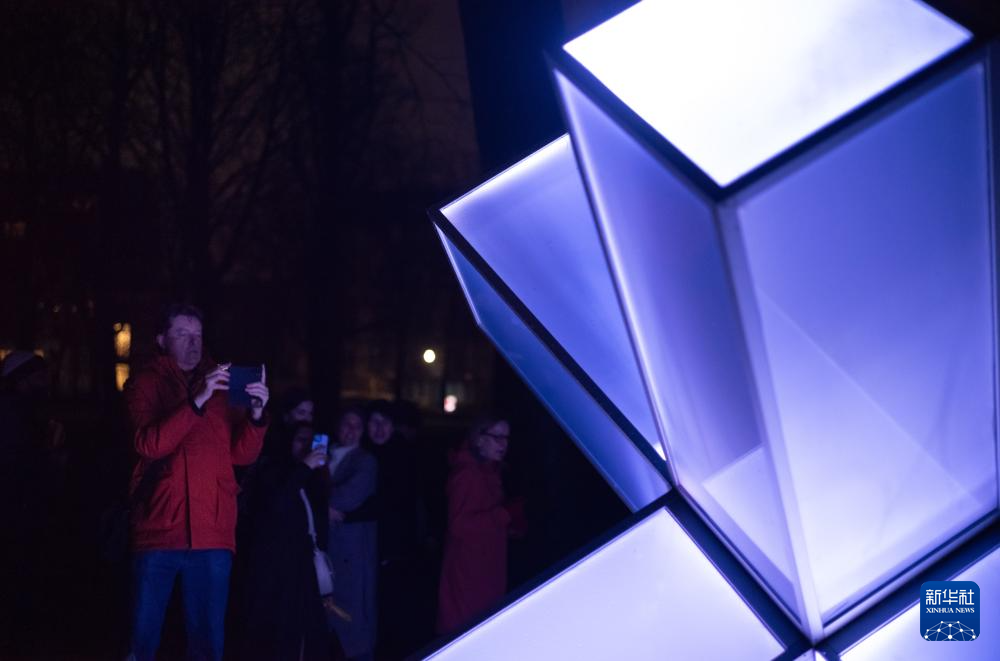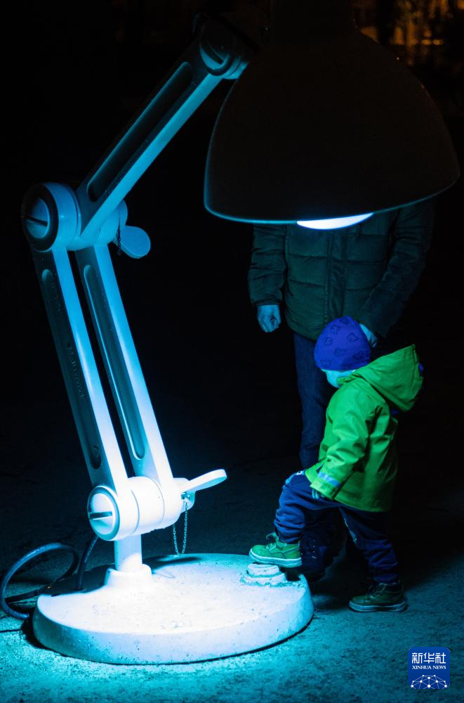 2月18日,人们在比利时布鲁塞尔五十周年纪念公园与灯光节装置互动。