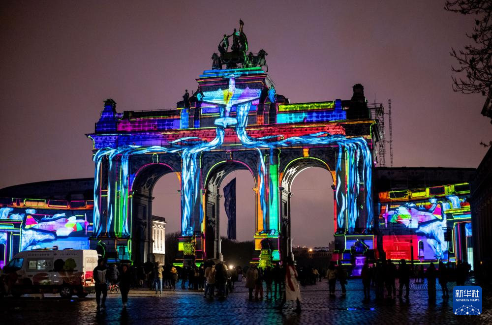 2月18日,人们在比利时布鲁塞尔五十周年纪念公园观赏灯光节展览。