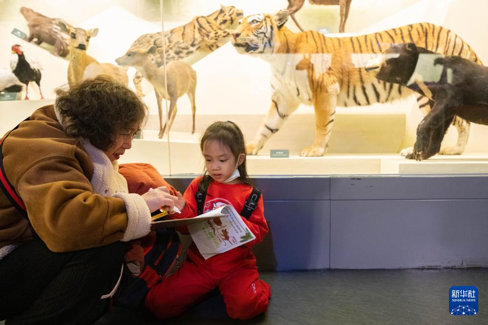 3月21日,在中国(哈尔滨)森林博物馆内,家长指导小朋友认识动物。