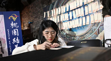 在天津市武清区一家文创商店内,马赛(右)手拿自己的作品和店员交流(3月23日摄)。