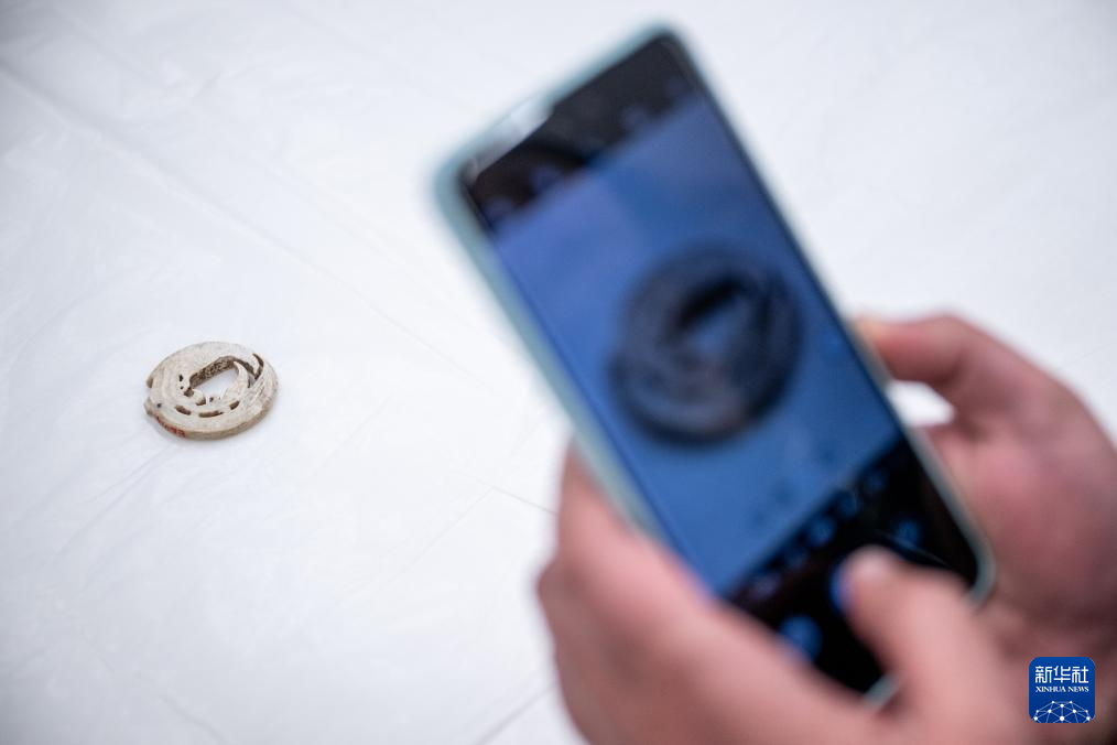 3月30日,工作人员在固定展品玉团凤。为迎接玉团凤,武汉盘龙城遗址博物院在玉团凤展柜上方将灯光布置成玉团凤形状。