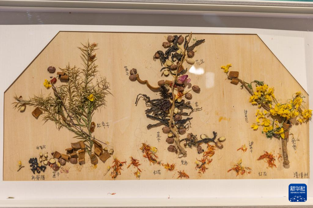 这是4月6日在“百草创艺”中医药艺术作品展现场拍摄的用废弃中药材制作的艺术作品。
