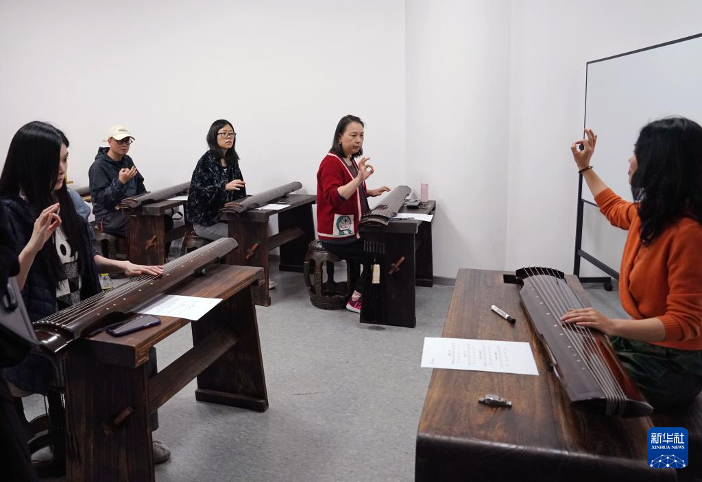 4月8日晚,在上海市群众艺术馆,夜校学员们在学习古琴课程。