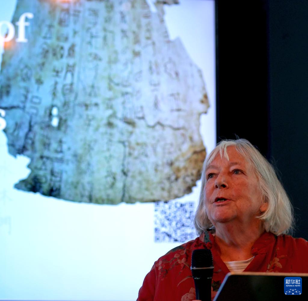 4月20日,在英国伦敦,英国知名汉学家弗朗西丝·伍德(中文名吴芳思)出席“汉字演变”主题展览。