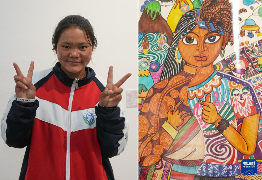 4月19日拍摄的拉萨市特殊教育学校13岁的听障学生白玛次仁和她的作品《放羊的小卓玛》(拼版照片)。