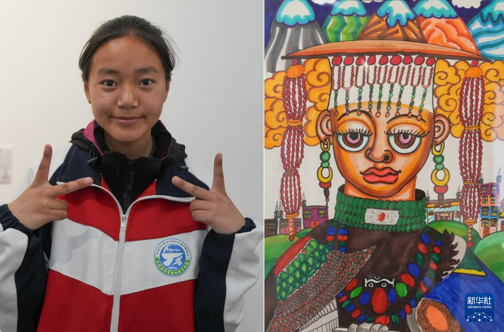 4月19日拍摄的拉萨市特殊教育学校14岁的听障学生贡觉央吉和她的作品《阿里服饰》(拼版照片)。