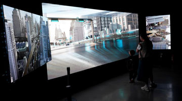 4月25日,在美国旧金山梅森堡中心举行的旧金山艺术博览会上,人们观看艺术作品。