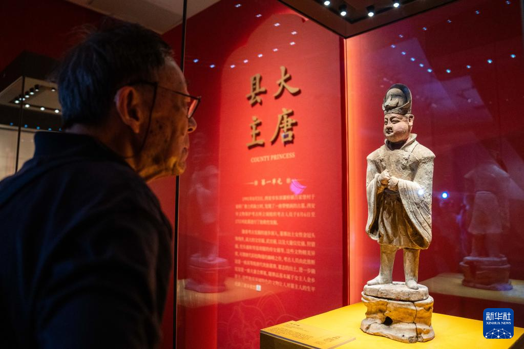 4月26日,在长沙博物馆,观众在参观金乡县主墓出土的唐代文物“武官俑”。