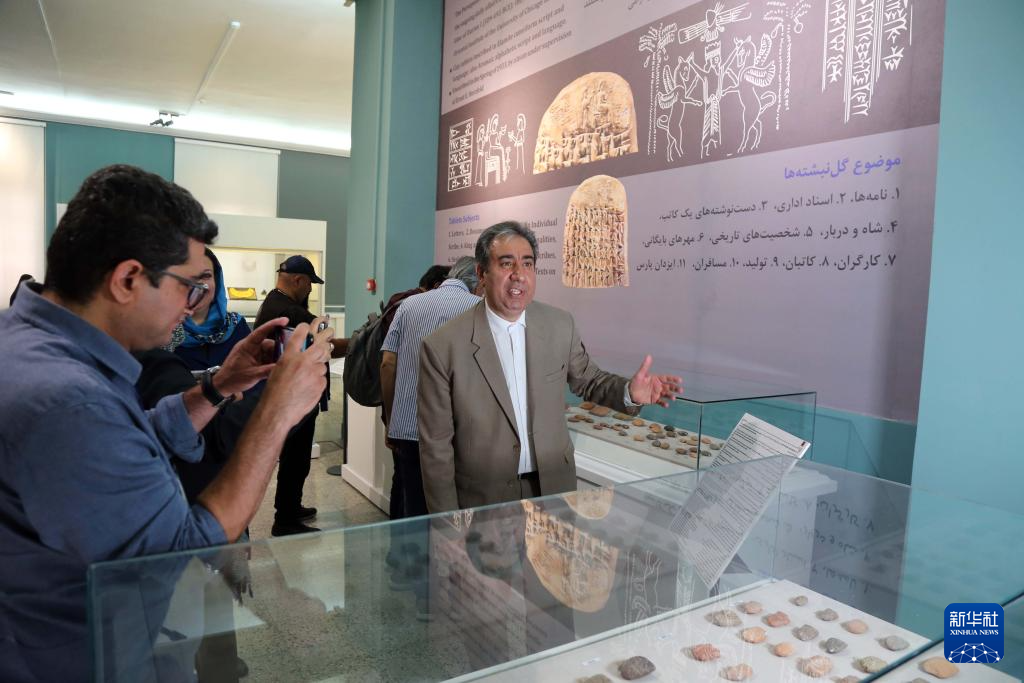 5月18日,在伊朗德黑兰,伊朗国家博物馆馆长杰布拉尔·诺坎德在介绍展出的古泥板情况。