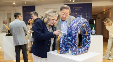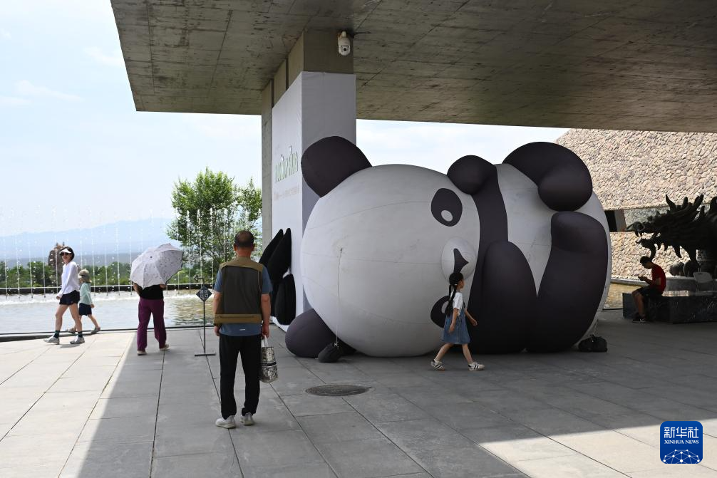 6月15日,在宁夏银川韩美林艺术馆,游客欣赏展出的大熊猫作品。
