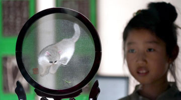 6月15日,在宁夏银川韩美林艺术馆,小朋友为大熊猫图案上色。